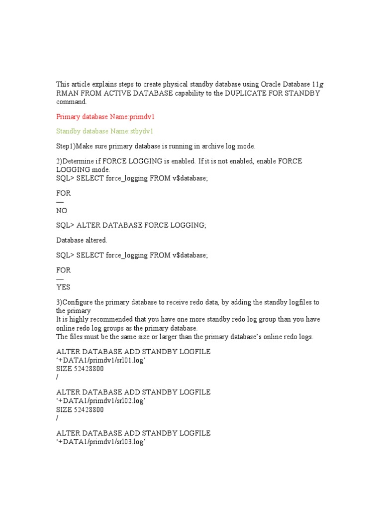 This article explains steps to create physical standby database using Oracle Database 11g RMAN FROM ACTIVE DATABASE capability to the DUPLICATE FOR STANDBY command. Primary database Name:primdv1 Standby database Name:stbydv1 Step1)Make sure primary database is running in archive log mode. 2)Determine if FORCE LOGGING is enabled. If it is not enabled, enable FORCE LOGGING mode. SQL> SELECT force_logging FROM v$database; FOR NO SQL> ALTER DATABASE FORCE LOGGING; Database altered. SQL> SELECT force_logging FROM v$database; FOR YES 3)Configure the primary database to receive redo data, by adding the standby logfiles to the primary It is highly recommended that you have one more standby redo log group than you have online redo log groups as the primary database. The files must be the same size or larger than the primary databases online redo logs. ALTER DATABASE ADD STANDBY LOGFILE +DATA1/primdv1/srl01.log SIZE 52428800 / ALTER DATABASE ADD STANDBY LOGFILE +DATA1/primdv1/srl02.log SIZE 52428800 / ALTER DATABASE ADD STANDBY LOGFILE +DATA1/primdv1/srl03.log