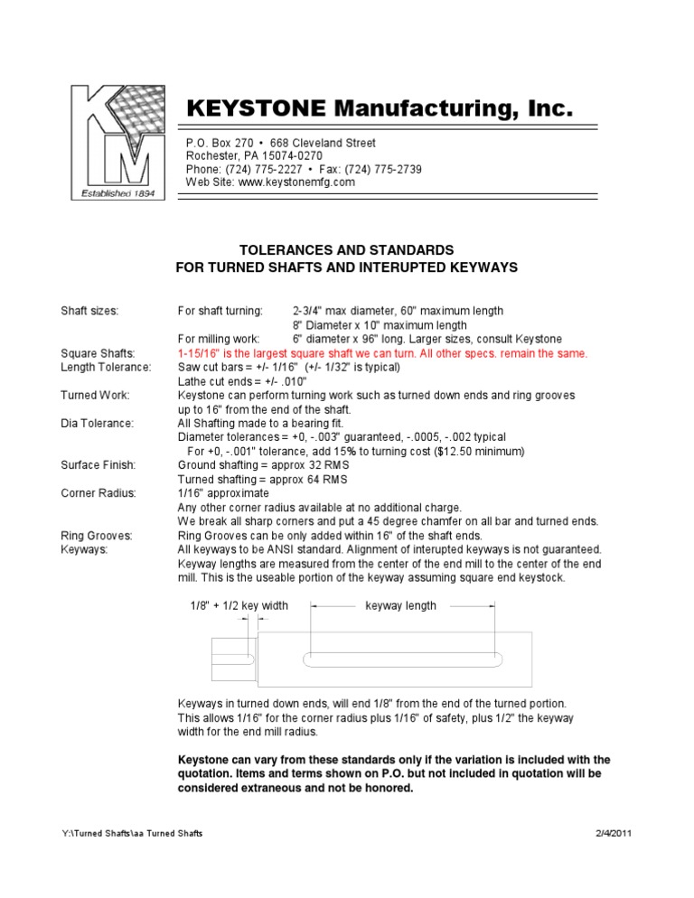 Keyways in turned down ends, will end 1/8" from the end of the turned portion. This allows 1/16" for the corner radius plus 1/16" of safety, plus 1/2" the keyway width for the end mill radius. Keystone can vary from these standards only if the variation is included with the quotation. Items and terms shown on P.O. but not included in quotation will be considered extraneous and not be honored.