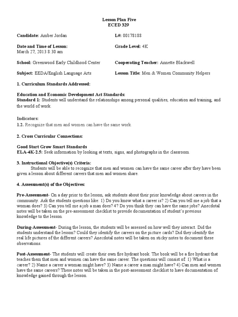 8:30 am School: Greenwood Early Childhood Center Subject: EEDA/English Language Arts 1. Curriculum Standards Addressed: Education and Economic Development Act Standards: Standard 1: Students will understand the relationships among personal qualities, education and training, and the world of work. Indicators: 1.2. Recognize that men and women can have the same work. 2. Cross Curricular Connections: Good Start Grow Smart Standards ELA-4K-2.5: Seek information by looking at texts, signs, and photographs in the classroom. 3. Instructional Objective(s) Criteria: Students will be able to recognize that men and women can have the same career after they have been given a lesson about different careers that men and women share. 4. Assessment(s) of the Objectives: Pre-Assessment- On a day prior to the lesson, ask students about their prior knowledge about careers in the community. Ask the students questions like: 1) Do you know what a career is? 2) Can you tell me a job that a woman does? 3) Can you tell me a job a man does? 4? Do you think they can have the same jobs? Anecdotal notes will be taken on the pre-assessment checklist to provide documentation of students previous knowledge to the lesson. During-Assessment- During the lesson, the students will be assessed on how well they interact. Did the students understand the lesson? Could they identify the careers on the picture cards? Did they identify the real life pictures of the different careers? Anecdotal notes will be taken on sticky notes to document these observations. Post-Assessment- The students will create their own fire hydrant book. The book will be a fire hydrant that teaches them that men and women can have the same career. The questions will consist of: 1) What is a career? 2) Name a career a woman might have? 3) Name a career a man might have? 4) Can men and women have the same careers? These notes will be taken in the post-assessment checklist to have documentation of knowledge gained through the lesson. L#: 00178188 Grade Level: 4K Cooperating Teacher: Annette Blackwell Lesson Title: Men & Women Community Helpers