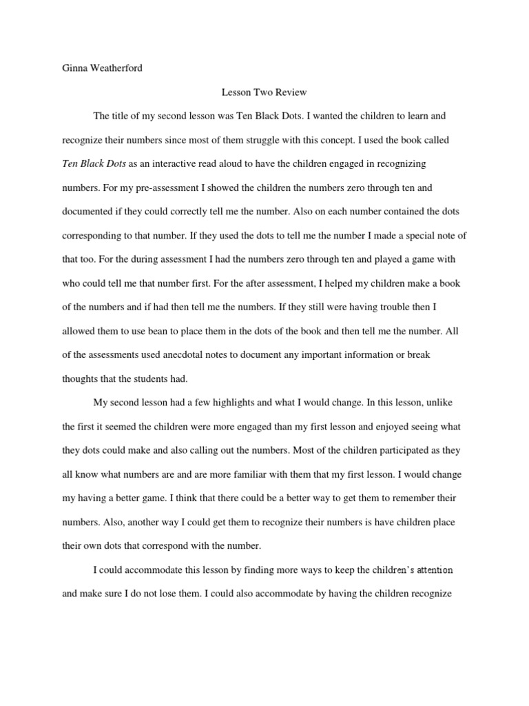 I wanted the children to learn and recognize their numbers since most of them struggle with this concept. I used the book called Ten Black Dots as an interactive read aloud to have the children engaged in recognizing numbers. For my pre-assessment I showed the children the numbers zero through ten and documented if they could correctly tell me the number. Also on each number contained the dots corresponding to that number. If they used the dots to tell me the number I made a special note of that too. For the during assessment I had the numbers zero through ten and played a game with who could tell me that number first. For the after assessment, I helped my children make a book of the numbers and if had then tell me the numbers. If they still were having trouble then I allowed them to use bean to place them in the dots of the book and then tell me the number. All of the assessments used anecdotal notes to document any important information or break thoughts that the students had. My second lesson had a few highlights and what I would change. In this lesson, unlike the first it seemed the children were more engaged than my first lesson and enjoyed seeing what they dots could make and also calling out the numbers. Most of the children participated as they all know what numbers are and are more familiar with them that my first lesson. I would change my having a better game. I think that there could be a better way to get them to remember their numbers. Also, another way I could get them to recognize their numbers is have children place their own dots that correspond with the number. I could accommodate this lesson by finding more ways to keep the childrens attention and make sure I do not lose them. I could also accommodate by having the children recognize