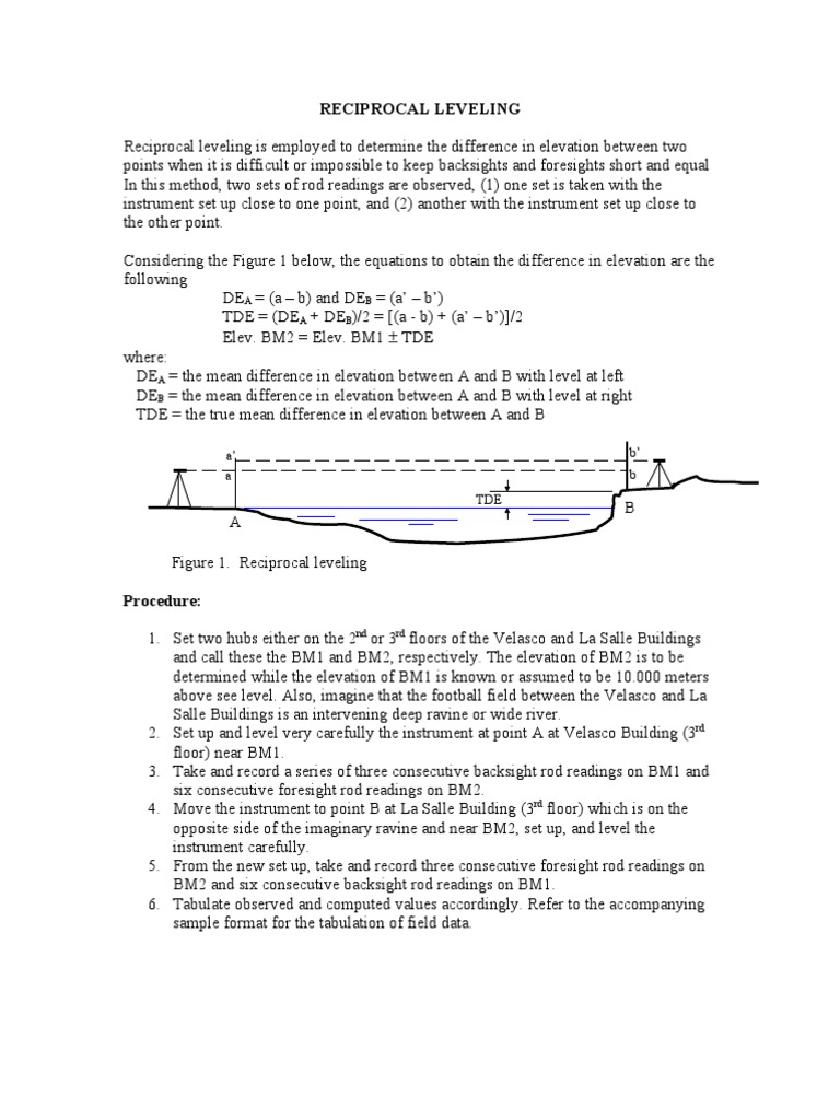 to keep backsights and foresights short and equal In this method, two sets of rod readings are observed, (1) one set is taken with the instrument set up close to one point, and (2) another with the instrument set up close to the other point. Considering the Figure 1 below, the equations to obtain the difference in elevation are the following DEA = (a b) and DEB = (a b) TDE = (DEA + DEB)/2 = [(a - b) + (a b)]/2 Elev. BM2 = Elev. BM1 TDE where: DEA = the mean difference in elevation between A and B with level at left DEB = the mean difference in elevation between A and B with level at right TDE = the true mean difference in elevation between A and B
