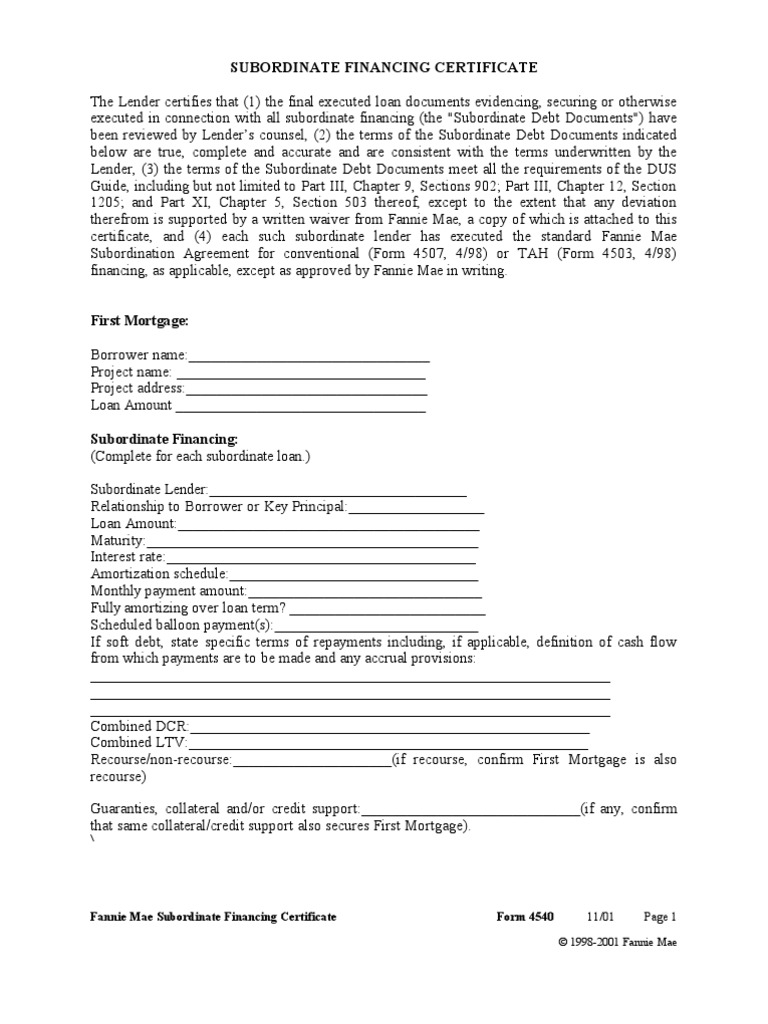 certificate, and (4) each such subordinate lender has executed the standard Fannie Mae