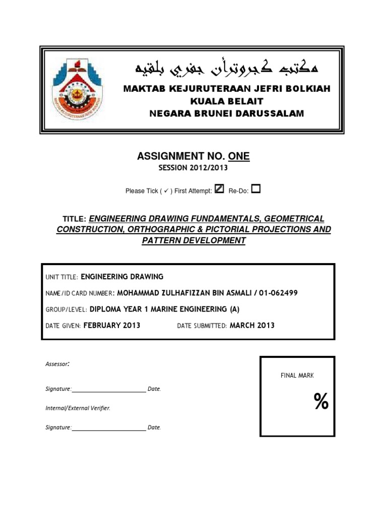 Engineering Drawing 3 Assignment 1 JEFRI BOLKIAH COLLEGE OF ENGINEERING BDTVEC Diploma in Marine Engineering (2012/2013) Introduction Engineering drawings convey accurate information about shape in a way which words cannot. This language of lines, signs and symbols has to be learned before it can be expressed on paper. When it is being expressed, it has to be understood by others. But in order for it to work effectively, everyone concerned must interpret the drawings in the same way so that there is uniformity in its interpretation. So the British Standard Institution has prepared a booklet BS 308:1972 having all the standards and conventions to be used. This standard is now adopted for the preparation of drawings used in the engineering industry. Basically, drawing is a principle means of communication in engineering. It is the method used to impact ideas and convey information and is often said to be the language of the engineer. It is an international language but it has its own rules and conventions. The purposes of studying Engineering Drawing: Develop the ability to produce simple Engineering Drawing and sketches based on current practice. Develop the skill to read manufacturing and construction drawing used in industry. Develop a working knowledge of the layout of plant and equipment. Develop skills in abstracting information from calculation sheets and schematic diagrams to produce working drawings for manufacturers, installers and fabricators.