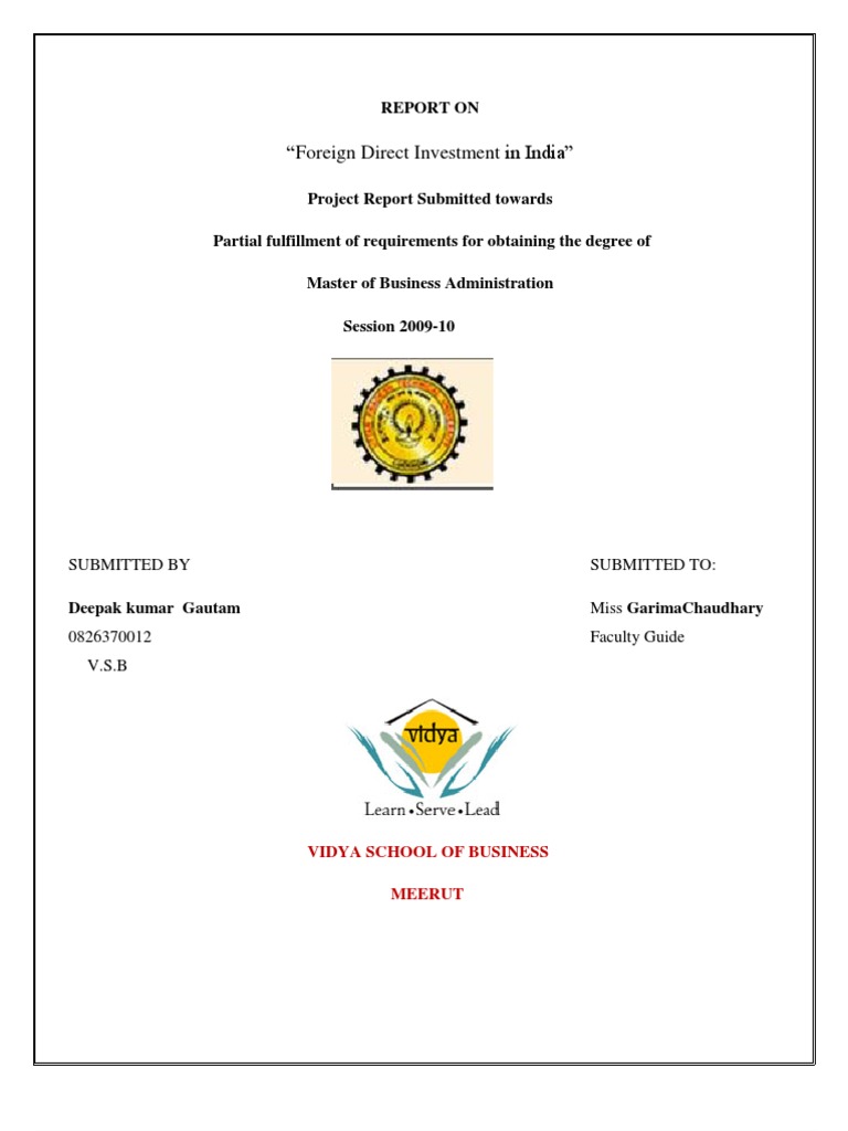 This is to certify that Deepak Kumar Gautam student of M.B.A IVsem, V.S.B. Meerut has under gone a research project on Analytical Study Of Foreign Direct Investment in India And submitted a report based on the same as a mandatory requirement for obtaining the degree of Master of Business Administration from Uttar Pradesh Technical University, Lucknow