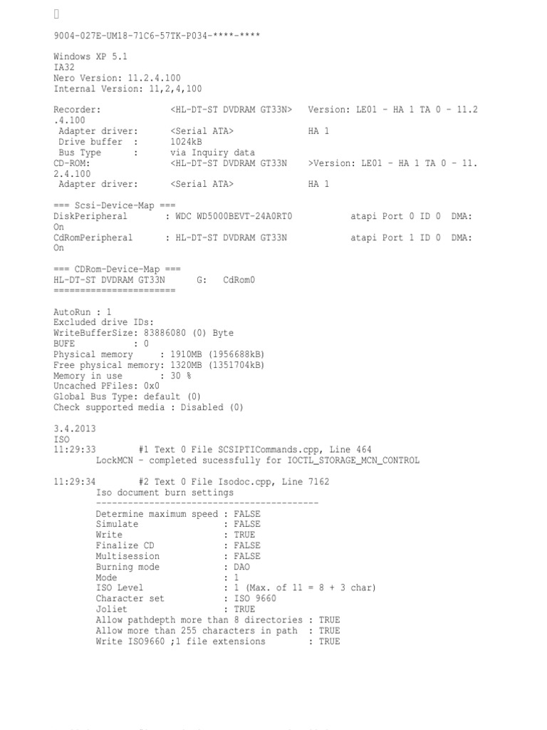 9004-027E-UM18-71C6-57TK-P034-****-**** Windows XP 5.1 IA32 Nero Version: 11.2.4.100 Internal Version: 11,2,4,100 Recorder: .4.