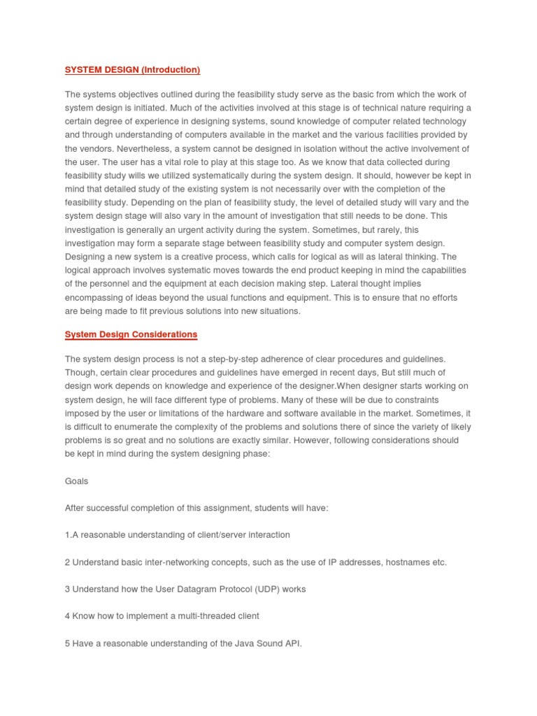 which the work of system design is initiated. Much of the activities involved at this stage is of technical nature requiring a certain degree of experience in designing systems, sound knowledge of computer related technology and through understanding of computers available in the market and the various facilities provided by the vendors. Nevertheless, a system cannot be designed in isolation without the active involvement of the user. The user has a vital role to play at this stage too. As we know that data collected during feasibility study wills we utilized systematically during the system design. It should, however be kept in mind that detailed study of the existing system is not necessarily over with the completion of the feasibility study. Depending on the plan of feasibility study, the level of detailed study will vary and the system design stage will also vary in the amount of investigation that still needs to be done. This investigation is generally an urgent activity during the system. Sometimes, but rarely, this investigation may form a separate stage between feasibility study and computer system design. Designing a new system is a creative process, which calls for logical as will as lateral thinking. The logical approach involves systematic moves towards the end product keeping in mind the capabilities of the personnel and the equipment at each decision making step. Lateral thought implies encompassing of ideas beyond the usual functions and equipment. This is to ensure that no efforts are being made to fit previous solutions into new situations. System Design Considerations The system design process is not a step-by-step adherence of clear procedures and guidelines. Though, certain clear procedures and guidelines have emerged in recent days, But still much of design work depends on knowledge and experience of the [Link] designer starts working on system design, he will face different type of problems. Many of these will be due to constraints imposed by the user or limitations of the hardware and software available in the market. Sometimes, it is difficult to enumerate the complexity of the problems and solutions there of since the variety of likely problems is so great and no solutions are exactly similar. However, following considerations should be kept in mind during the system designing phase: Goals After successful completion of this assignment, students will have: 1.A reasonable understanding of client/server interaction 2 Understand basic inter-networking concepts, such as the use of IP addresses, hostnames etc. 3 Understand how the User Datagram Protocol (UDP) works 4 Know how to implement a multi-threaded client 5 Have a reasonable understanding of the Java Sound API.