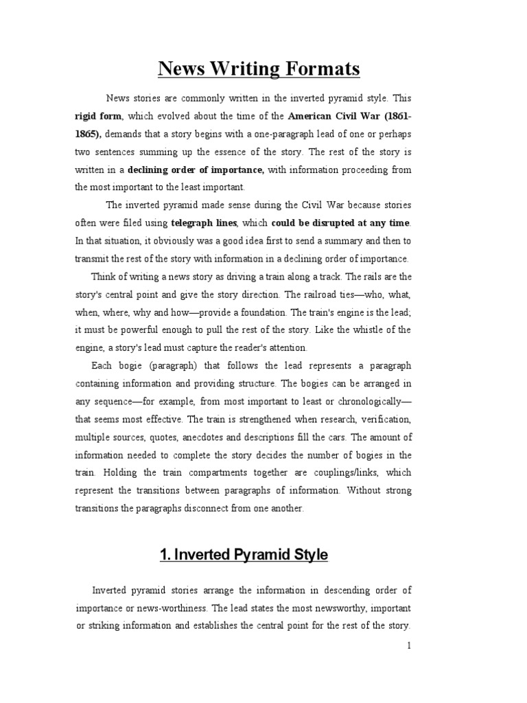 News stories are commonly written in the inverted pyramid style. This rigid form, which evolved about the time of the American Civil War (18611865), demands that a story begins with a one-paragraph lead of one or perhaps two sentences summing up the essence of the story. The rest of the story is written in a declining order of importance, with information proceeding from the most important to the least important. The inverted pyramid made sense during the Civil War because stories often were filed using telegraph lines, which could be disrupted at any time . In that situation, it obviously was a good idea first to send a summary and then to transmit the rest of the story with information in a declining order of importance. Think of writing a news story as driving a train along a track. The rails are the story's central point and give the story direction. The railroad tieswho, what, when, where, why and howprovide a foundation. The train's engine is the lead; it must be powerful enough to pull the rest of the story. Like the whistle of the engine, a story's lead must capture the reader's attention. Each bogie (paragraph) that follows the lead represents a paragraph containing information and providing structure. The bogies can be arranged in any sequencefor example, from most important to least or chronologically that seems most effective. The train is strengthened when research, verification, multiple sources, quotes, anecdotes and descriptions fill the cars. The amount of information needed to complete the story decides the number of bogies in the train. Holding the train compartments together are couplings/links, which represent the transitions between paragraphs of information. Without strong transitions the paragraphs disconnect from one another.