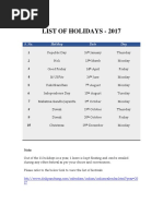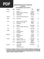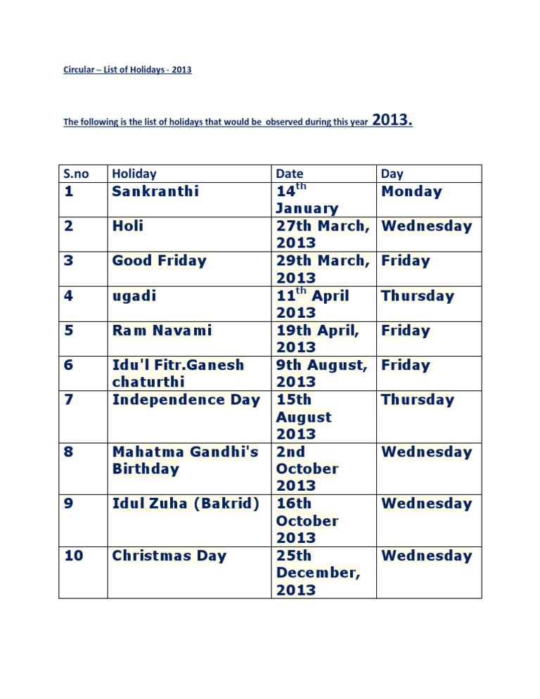 Circular List of Holidays - 2013