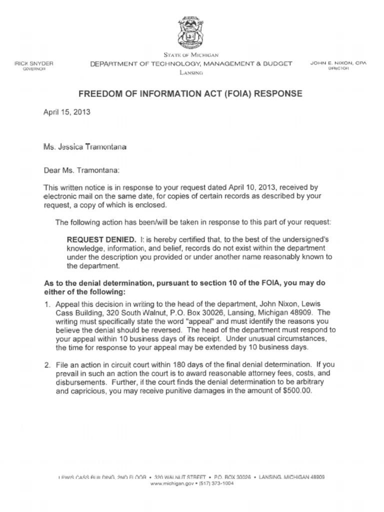 Letter received from DTMB denying our FOIA request.