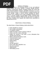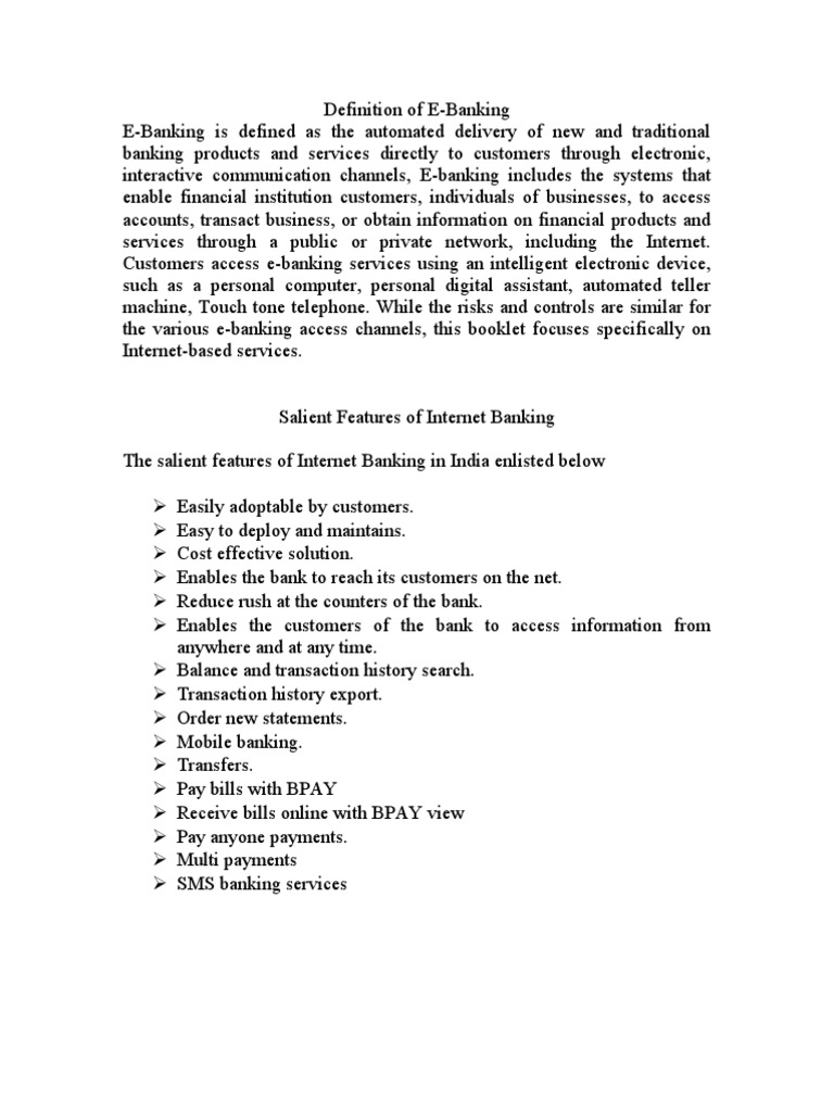 to customers through electronic, interactive communication channels, E-banking includes the systems that enable financial institution customers, individuals of businesses, to access accounts, transact business, or obtain information on financial products and services through a public or private network, including the Internet. Customers access e-banking services using an intelligent electronic device, such as a personal computer, personal digital assistant, automated teller machine, Touch tone telephone. While the risks and controls are similar for the various e-banking access channels, this booklet focuses specifically on Internet-based services. Salient Features of Internet Banking The salient features of Internet Banking in India enlisted below Easily adoptable by customers. Easy to deploy and maintains. Cost effective solution. Enables the bank to reach its customers on the net. Reduce rush at the counters of the bank. Enables the customers of the bank to access information from anywhere and at any time. Balance and transaction history search. Transaction history export. Order new statements. Mobile banking. Transfers. Pay bills with BPAY Receive bills online with BPAY view Pay anyone payments. Multi payments SMS banking services