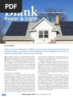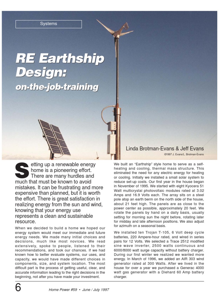 In Summary There are three areas of concern in setting up a RE system: energy production, energy storage, and energy consumption. All three must be understood and analyzed separately and then related to each other. A fourth area to be considered is home design for equipment placement. Each component has to be considered for price and for compatibility. Size your system and your needs carefully before you make purchases. The more you can anticipate your needs and type of system for all circumstances, the better your chances of saving time, labor, and money. A small PV system in tandem with a wind turbine can be used dependably for a wide variety of purposes. The issue central to system size is lifestyle. If you want to match the capacity of an on-grid home then you will need a very large system. If you decide to limit use and curtail energy related activities then you will be able to live with a smaller investment. Our form of conservation depends on the knowledge that peak power consumption and off-hour use can be successfully balanced. Access Authors: Jeff and Linda Brotman-Evans, PO Box 2827, Grand Junction, CO 81502 970-256-7405