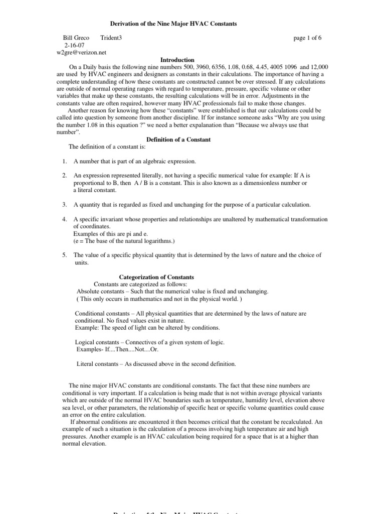On a Daily basis the following nine numbers 500, 3960, 6356, 1.08, 0.68, 4.45, 4005 1096 and 12,000are used by HVAC engineers and designers as constants in their calculations. The importance of having acomplete understanding of how these constants are constructed cannot be over stressed. If any calculationsare outside of normal operating ranges with regard to temperature, pressure, specific volume or othervariables that make up these constants, the resulting calculations will be in error. Adjustments in theconstants value are often required, however many HVAC professionals fail to make those changes.
