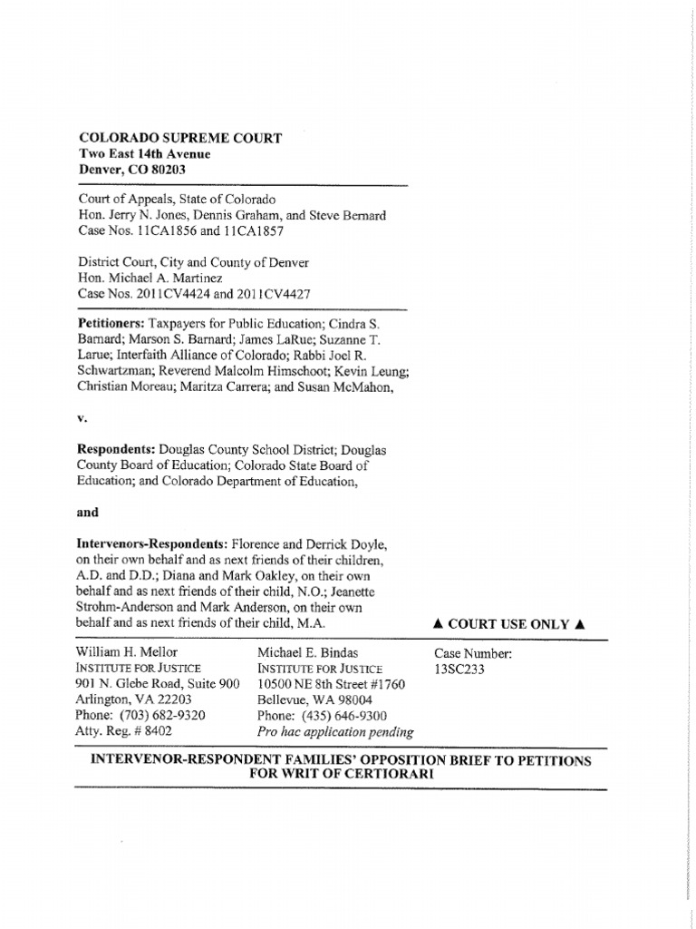 Opposition Brief filed with the Colorado Supreme Court by the Institute for Justice on behalf of families served by the Douglas County Choice Scholarship Program.