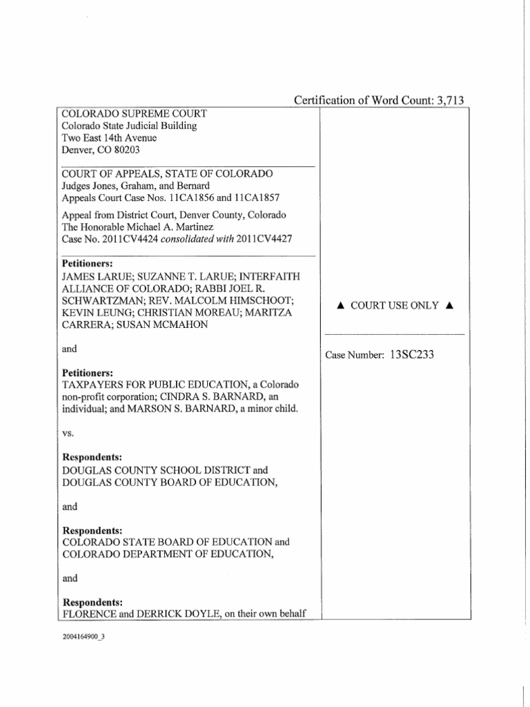 Opposition Brief filed with the Colorado Supreme Court by the Douglas County Board of Education in support of the district's groundbreaking Choice Scholarship Program.