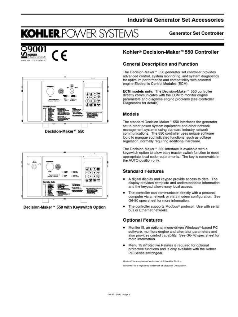 The Decision-Makert 550 generator set controller provides advanced control, system monitoring, and system diagnostics for optimum performance and compatibility with selected engine Electronic Control Modules (ECM). ECM models only: The Decision-Makert 550 controller directly communicates with the ECM to monitor engine parameters and diagnose engine problems (see Controller Diagnostics for details).