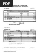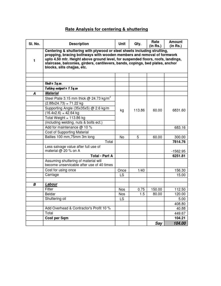 Unit = Sq.m. Taking output = 1 Sq.m Material 2 Steel Plate 3.15 mm thick @ 24.73 kg/m (2.88x24.73) = 71.22 kg Supporting Angle (35x35x5) @ 2.6 kg/m (16.4x2.6) = 42.64 kg Total Weight = 113.86 kg (including welding, nuts & bolts ect.) Add for maintenance @ 10 % Cost of Supporting Material Ballies 100 mm,75mm 3m long Total Less salvage value after full use of material @ 20 % on A Total - Part A Assuming shuttering of material will become unservicable after use of 40 times Cost for using once Carriage Labour Fitter Beldar Shuttering oil Add Overhead & Contractor's Profit 10 % Total Cost per Sqm