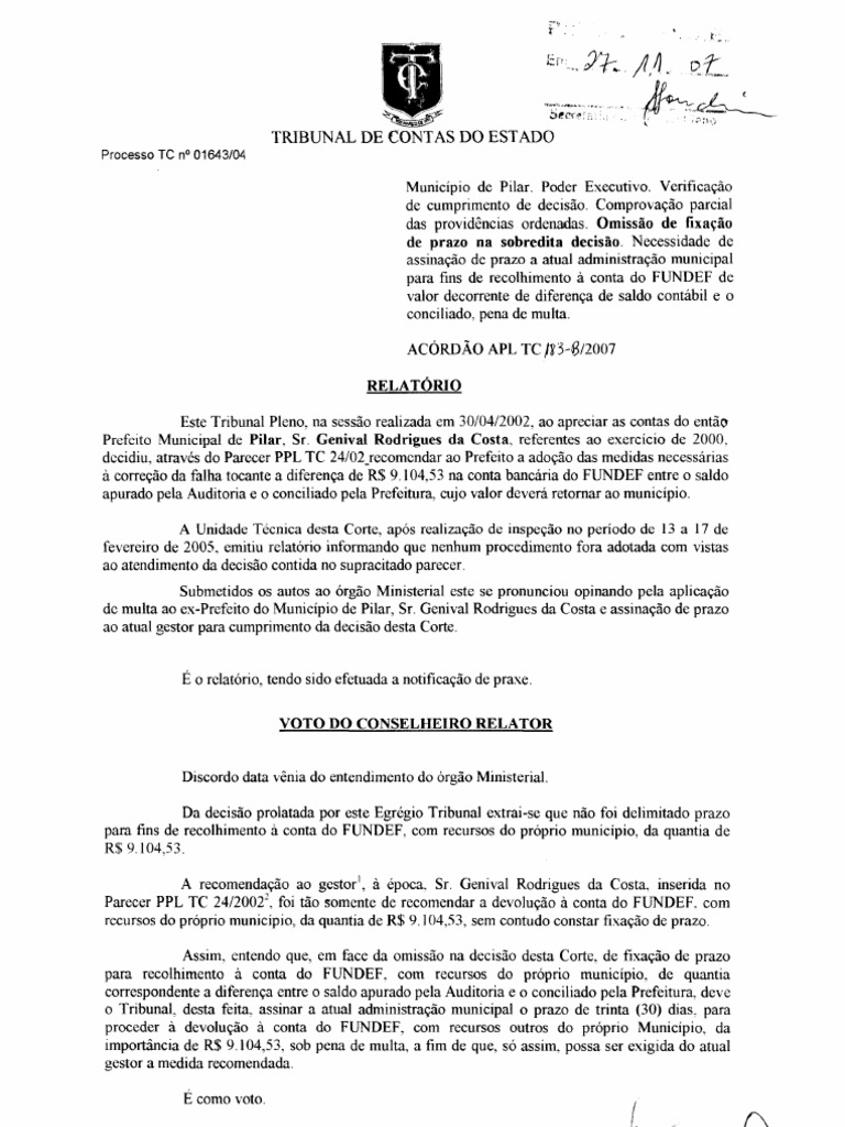 de multa ao ex-Prefeito do Município de Pilar, Sr. Genival Rodrigues da Costa e assinação de prazo