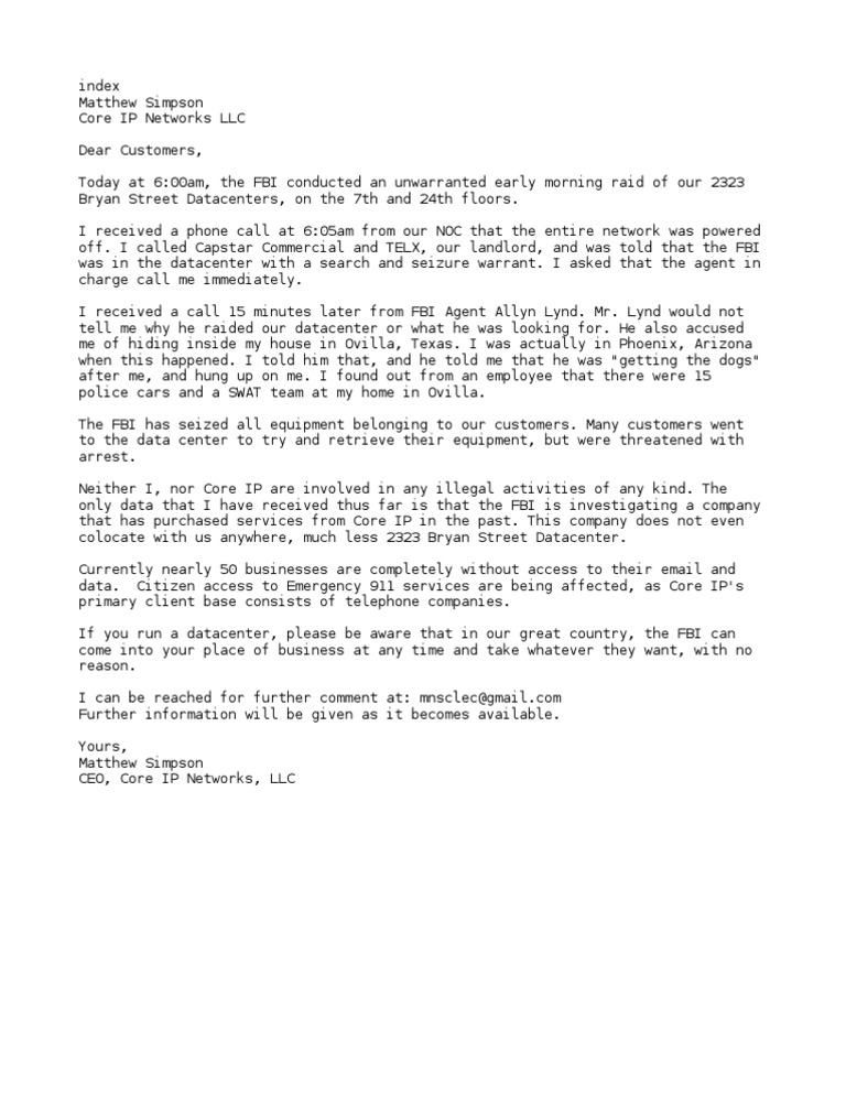 was in the datacenter with a search and seizure warrant. I asked that the agent in