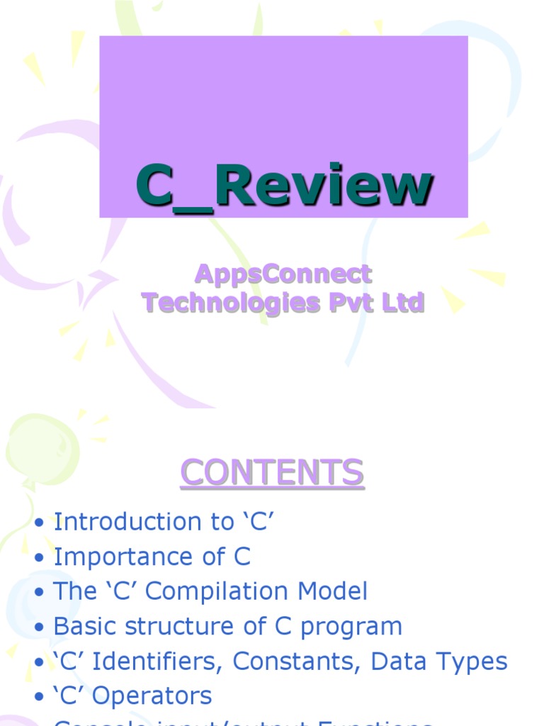 Introduction to C Importance of C The C Compilation Model Basic structure of C program C Identifiers, Constants, Data Types C Operators Console input/output Functions