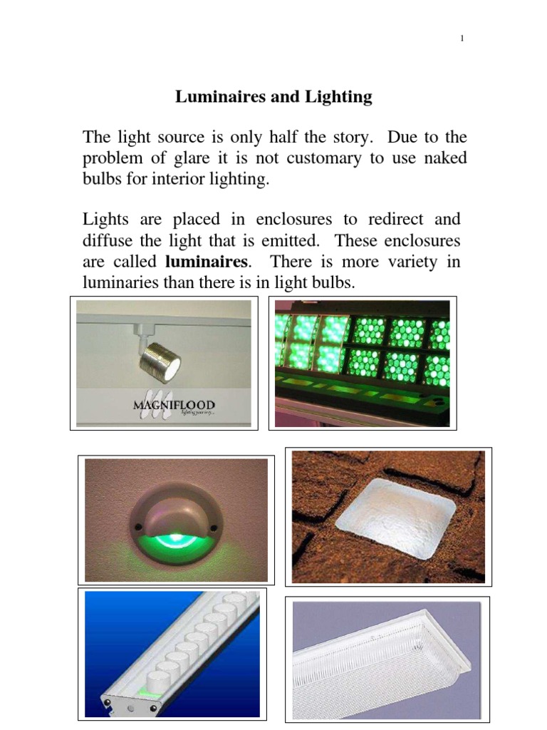 Luminaires and Lighting The light source is only half the story. Due to the problem of glare it is not customary to use naked bulbs for interior lighting. Lights are placed in enclosures to redirect and diffuse the light that is emitted. These enclosures are called luminaires. There is more variety in luminaries than there is in light bulbs.
