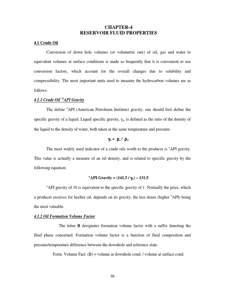 4.1 Crude Oil Conversion of down hole volumes (or volumetric rate) of oil, gas and water to equivalent volumes at surface conditions is made so frequently that it is convenient to use conversion factors, which account for the overall changes due to solubility and compressibility. The most important units used to measure the hydrocarbon volumes are as follows: 4.1.1 Crude Oil OAPI Gravity The define oAPI (American Petroleum Institute) gravity, one should first define the specific gravity of a liquid. Liquid specific gravity, o, is defined as the ratio of the density of the liquid to the density of water, both taken at the same temperature and pressure. o = o / w The most widely used indicator of a crude oils worth to the producer is oAPI gravity. This value is actually a measure of an oil density, and is related to specific gravity by the following equation: