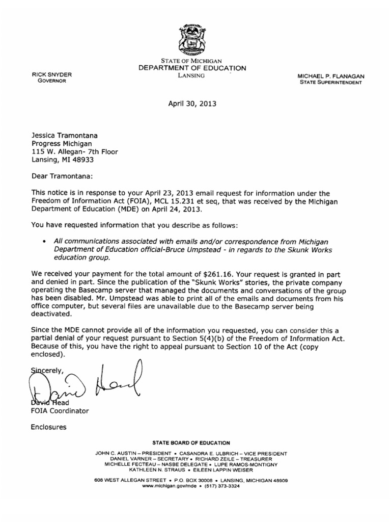 Documents released by the Michigan Department of Education in response to a FOIA request made by Progress Michigan.