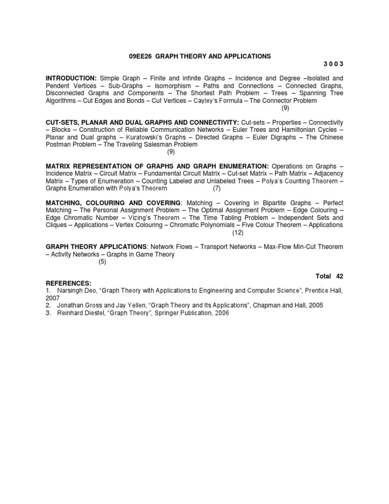 nd Degree Isolated and Pendent Vertices Sub-Graphs Isomorphism Paths and Connections Connected Graphs, Disconnected Graphs and Components The Shortest Path Problem Trees Spanning Tree Algorithms Cut Edges and Bonds Cut Vertices Cayleys Formula The Connector Problem (9) CUT-SETS, PLANAR AND DUAL GRAPHS AND CONNECTIVITY: Cut-sets Properties Connectivity Blocks Construction of Reliable Communication Networks Euler Trees and Hamiltonian Cycles Planar and Dual graphs Kuratowskis Graphs Directed Graphs Euler Digraphs The Chinese Postman Problem The Traveling Salesman Problem (9) MATRIX REPRESENTATION OF GRAPHS AND GRAPH ENUMERATION: Operations on Graphs Incidence Matrix Circuit Matrix Fundamental Circuit Matrix Cut-set Matrix Path Matrix Adjacency Matrix Types of Enumeration Counting Labeled and Unlabeled Trees Polyas Counting Theorem Graphs Enumeration with Polyas Theorem (7) MATCHING, COLOURING AND COVERING: Matching Covering in Bipartite Graphs Perfect Matching The Personal Assignment Problem The Optimal Assignment Problem Edge Colouring Edge Chromatic Number Vizings Theorem The Time Tabling Problem Independent Sets and Cliques Applications Vertex Colouring Chromatic Polynomials Five Colour Theorem Applications (12) GRAPH THEORY APPLICATIONS: Network Flows Transport Networks Max-Flow Min-Cut Theorem Activity Networks Graphs in Game Theory (5) Total 42 REFERENCES: 1. Narsingh Deo, Graph Theory with Applications to Engineering and Computer Science, Prentice Hall, 2007 2. Jonathan Gross and Jay Yellen, Graph Theory and Its Applications , Chapman and Hall, 2005 3. Reinhard Diestel, Graph Theory, Springer Publication, 2006