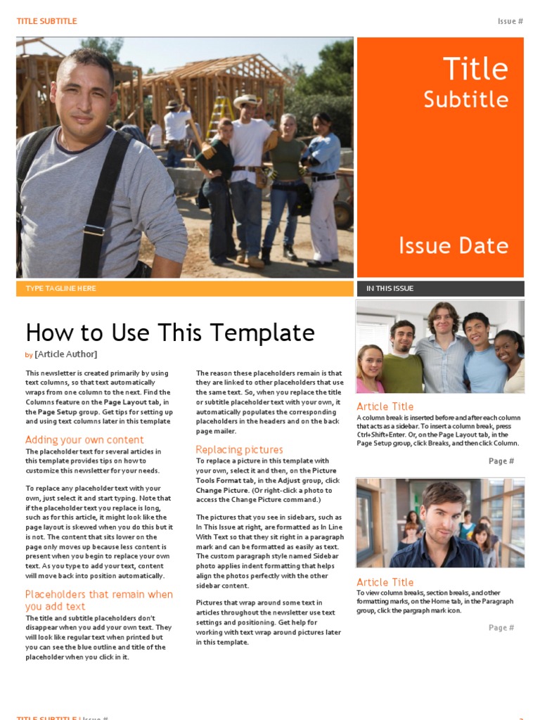 The body text throughout the articles in this template uses the Normal paragraph style. Following are some other styles applied throughout the template: Large article titles, such as on the first page, use Heading 1 style. Orange headings in the sidebars and within articles use Sidebar Heading style. Orange section titles in articles use the Heading 2 style. Small article titles use Heading 3 style. This style is List Bullet 2. This style is List Continue. Text in sidebars uses the Sidebar Text style. White headings on orange text in tables uses the Heading 4 style. The heading inside contact information tables uses Heading 5 style. Contact Info is the name of the gray text style inside the small contact tables. Access all styles used in this template on the Home tab, in the Styles group. Using styles helps save you time and keep your document consistent. To modify a style, on the Home tab, in the Styles group, rightclick the name of the style you want to edit and then click Modify. All content where the style is applied will update automatically. Another way to modify a style is to simply customize an instance of the style where its applied in the document. Then, on the Home tab, in the Styles group, right-click the style name and then click Update [style] to Match Selection. HEADING 4 STYLE