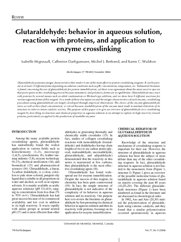 croscopy. Academic Press, New York. [Link], J.A. 2000. Formaldehyde, formalin, paraformaldehyde and glutaraldehyde: what they are and what they do. Microsc. Today 00-1:8-12. [Link], D. 1972. Theoretical and practical aspects of glutaraldehyde. Histochem. J. 4:267-303. [Link], M.L., E.H. Harris Jr, J. Naghski, and E.M. Filachione. 1959. Tanning with glutaraldehyde. I. Rate studies. J. Amer. Leather Chem. Ass. 54:488-502. [Link], E.M., M.L. Fein, and E.H. Harris Jr. 1964. Tanning with glutaraldehyde. J. Amer. Leather. Chem. Ass. 59:281-292. [Link], F.A. and F.M. Richards. 1966. The enzymic behavior of carboxypeptidase-A in the solid state. Biochemistry. 5:4062-4076. [Link], F.M. and J.R. Knowles. 1968. Glutaraldehyde as a protein cross-linkage reagent. J. Mol. Biol. 37:231-233. [Link], A. and A. Bar-Eli. 1970. Preparation and properties of crosslinked water-insoluble catalase. Arch. Biochem. Biophys. 136:325-330. [Link], S.N., B.I. Chodorov, and M.V. Volkenstein. 1971. Molecular mechanisms of membrane ionic permeability changes. Biochim. Biophys. Acta 225:1-10. [Link], P. 1978. Influence of the conditions of trypsin immobilization onto Spherosil on coupling efficiency. Eur. J. Appl. Microbiol. Biotechnol. 5:1-11. [Link], S.P., E.M. Scott, and A.D. Russell. 1980. Antimicrobial activity, uses and mechanism of action of glutaraldehyde. J. Appl. Bacteriol. 48:161-190. [Link], M.E., D. Cheung, B. Strates, M. Kodama, and K. Sheikh. 1987. Chemically modified collagen: a natural biomaterial for tissue replacement. J. Biomed. Mater. Res. 21:741-771. [Link], R.E., H.C. Hodge, R.P. Smith, and M.N. Gleason. 1976. Clinical Toxicology of Commercial Products. Acute Poisoning, 4th ed. The Williams & Wilkins Co., Baltimore, MD. [Link], K., I. Urabe, Y. Yamada, and H. Okada. 1991. Reaction of glutaraldehyde with amino and thiol compounds. J. Ferment. Bioeng. 71:100-105. [Link], J.H. and C.W. Cater. 1968. The interaction of aldehydes with collagen. Biochim. Biophys. Acta 168:341-352. [Link], D.R. and V. Agayn. 1994. The chemistry of enzyme and protein immobilization with glutaraldehyde. Trends Anal. Chem. 13:425-430. [Link], C. and Y. Aito. 1962. Intramolecularintermolecular polymerization of glutaraldehyde. Bull. Chem. Soc. Japan 35:1426. [Link], P.M., A.C. Nicholls, and H.N. Rydon. 1969. The nature of glutaraldehyde in aqueous solution. J. Chem. Soc. Chem. Commun. 10:565-566. [Link], A.H., S.H. Feairheller, and E.M. Filachione. 1972. Glutaraldehyde: nature of the reagent. J. Mol. Biol. 65:525-529. [Link], P., G. Puzo, and H. Mazarguil. 1975. tude du mcanisme dtablissement des liaisons glutaraldehyde protines. Biochimie 57:1281-1292. Vol. 37, No. 5 (2004)