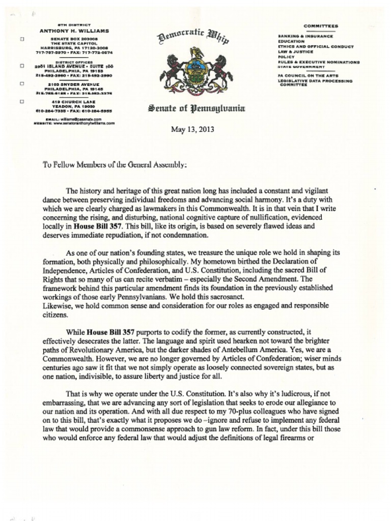 In response to the growing support for Pennsylvania House Bill 357, a bill intended to nullify new federal firearms laws, Sen. Williams circulated a garbled letter to the members of the Gene…