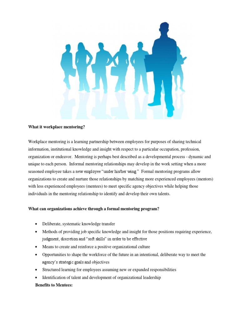 Workplace mentoring is a learning partnership between employees for purposes of sharing technical information, institutional knowledge and insight with respect to a particular occupation, profession, organization or endeavor. Mentoring is perhaps best described as a developmental process - dynamic and unique to each person. Informal mentoring relationships may develop in the work setting when a more seasoned employee takes a new employee under his/her wing. Formal mentoring programs allow organizations to create and nurture those relationships by matching more experienced employees (mentors) with less experienced employees (mentees) to meet specific agency objectives while helping those individuals in the mentoring relationship to identify and develop their own talents.