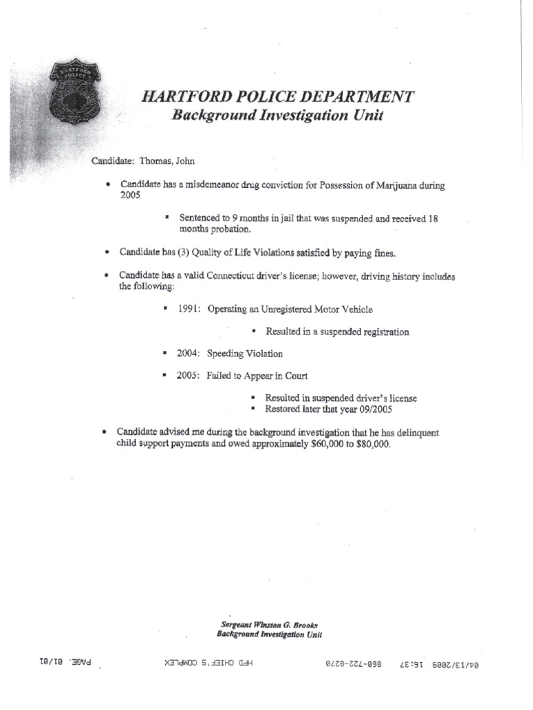 Candidate has a misdemeanor drug conviction for Possession of Marijuana during 2005 Sentenced to 9 months in jail that was suspended and received 18 months probation. Candidate has (3) Quality of Life Violations satisfied by paying fines. Candidate advised me during the background investigation that he has delinquent child support payments and owed approximately $60,000 to $803000.