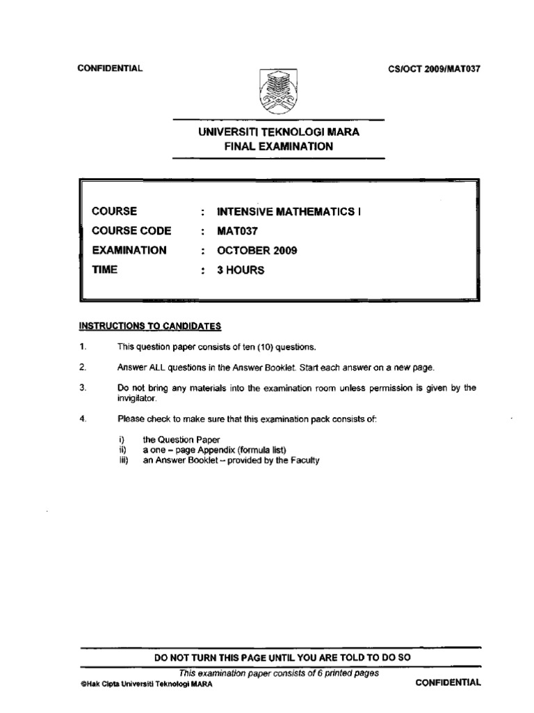 INTENSIVE MATHEMATICS 1 MAT037 OCTOBER 2009 3 HOURS