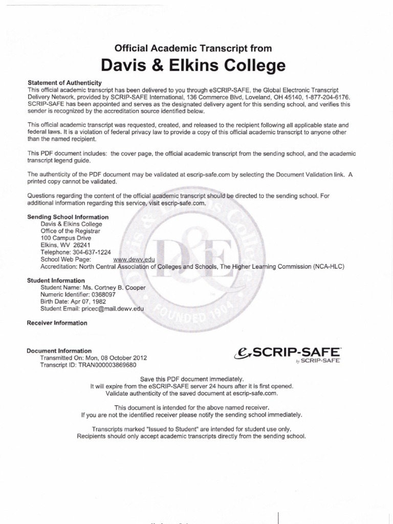 Student Name: Ms. Cortney B. Cooper Numeric ldentifier: 0368097 Birth Date: Apr 07, 1982 Student Email: pricec@mail.dewv,edu