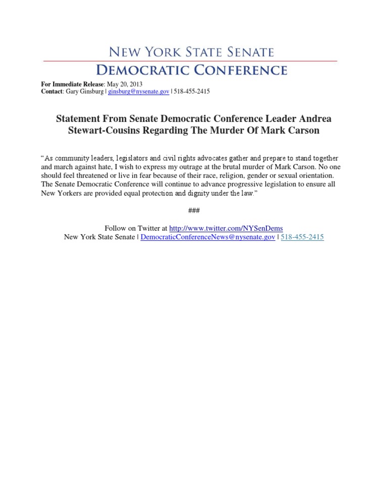 Statement From Senate Democratic Conference Leader AndreaStewart-Cousins Regarding The Murder Of Mark Carson