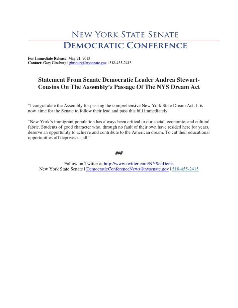 I congratulate the Assembly for passing the comprehensive New York State Dream Act. It isnow time for the Senate to follow their lead and pass this bill immediately.