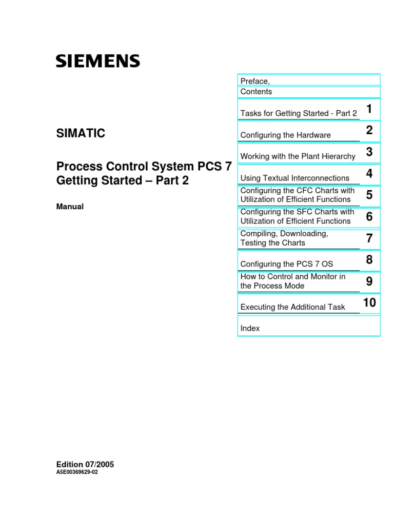 Configuring the Hardware Working with the Plant Hierarchy Using Textual Interconnections Configuring the CFC Charts with Utilization of Efficient Functions Configuring the SFC Charts with Utilization of Efficient Functions Compiling, Downloading, Testing the Charts Configuring the PCS 7 OS How to Control and Monitor in the Process Mode Executing the Additional Task Index
