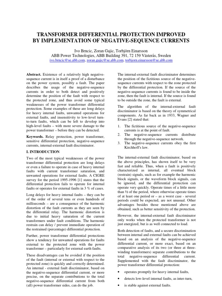 V. CONCLUSIONS The existence of relatively high negative-sequence currents is per se an indication of a disturbance, possibly a fault, as the negative-sequence currents are superimposed, pure-fault quantities. The negative-sequence quantities are particularly suitable for different kinds of directional tests. One of the advantages of the negative-sequence system, when compared to the zero-sequence system, is that the negative-sequence system is not stopped at power transformers of the Yd, or Dy connection. Further, the usage of the negative-sequence system is not limited to faults including earth. Moreover, even balanced, symmetrical faults can be successfully treated due to the transient three-phase fault generated negative-sequence current. The negative-sequence quantities are extensively used in the field of relay protection, particularly in the protection of power lines. The negativesequence currents can as well be applied with advantage to the protection of power transformers. However, the task of determining the position of a fault as inside or outside the protected zone which includes a power transformer is complicated by the changes in magnitudes and the phase shifts associated with power transformers. But, if these are properly compensated, the negative-sequence currents are a good means to determine the position of a fault with respect to the protected zone. The internal - external fault discriminator, based on the directional comparison carried out on pairs of contributions to the total negative-sequence differential current, proved very reliable. It takes typically only a couple of milliseconds to detect a fault, and altogether 6 to 8 milliseconds to characterize it as internal or external. By using the discriminator as a complement to the traditional restrained differential protection, some of its typical weaknesses, namely extra delays in case of heavy internal faults with current transformer saturation, and the danger of unwanted operations for external faults, is diminished. Sensitivity of the protection to low-level faults, such as inter-turn, is increased. VI. REFERENCES