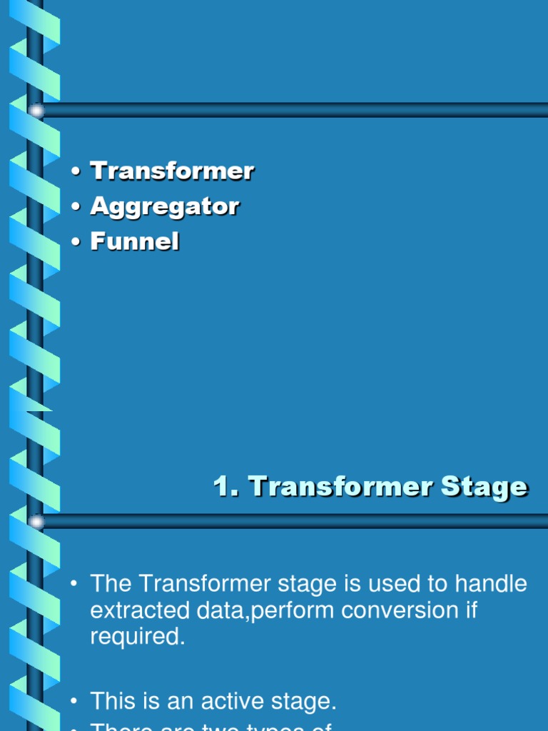 The Transformer stage is used to handle extracted data,perform conversion if required. This is an active stage. There are two types of [Link] and Basic.