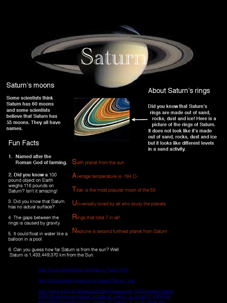Sixth planet from the sun Average temperature is -184 CTitan is the most popular moon of the 53 Universally loved by all who study the planets Rings that total 7 in all! Neptune is second furthest planet from Saturn
