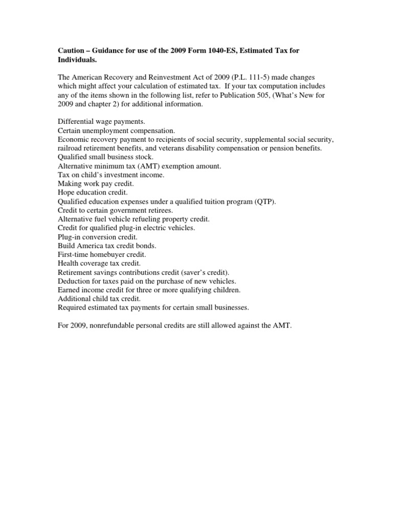 Caution - Guidance For Use of The 2009 Form 1040-ES, Estimated Tax For Individuals