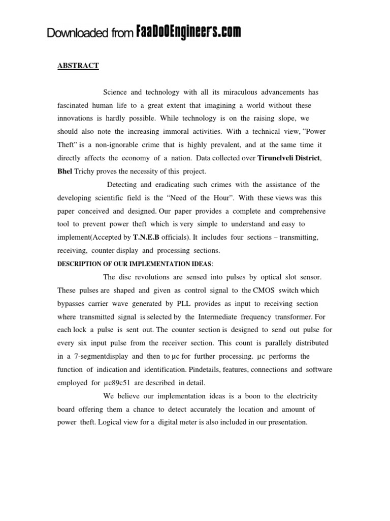 Our implementation may gives a big hand to vigilance squad to control theft quickly and easily Using this same logic, instead of micro controller we can adapt computer for more number of uses In day-to-day conventional methods, its possible to identify the theft but the extent of theft cannot be identified but its possible with our Check meter and remote meter readers. Compact size, Reliability, lightweight for quick operation and high accuracy makes the system more effective. Maintenance holds more value than construction. In our case, cost is very less, it involves the planned serving of equipment at regular interval. Emergency maintenance is the case when the maintenance crew due to repair of any sections can be succeeded by, A rational spare parts policy. A maintenance staff of highly skilled, highly trained personnel.