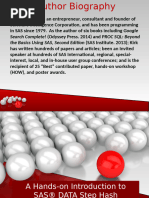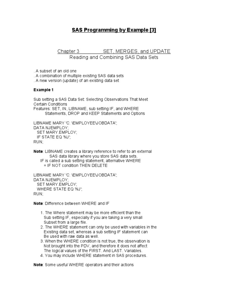 . A subset of an old one . A combination of multiple existing SAS data sets . A new version (update) of an existing data set Example 1 Sub setting a SAS Data Set: Selecting Observations That Meet Certain Conditions Features: SET, IN, LIBNAME, sub setting IF, and WHERE Statements, DROP and KEEP Statements and Options LIBNAME MARY 'C: \EMPLOYEE\JOBDATA'; DATA NJEMPLOY; SET MARY.EMPLOY; IF STATE EQ 'NJ'; RUN; Note: LIBNAME creates a library reference to refer to an external SAS data library where you store SAS data sets. IF is called a sub setting statement, alternative WHERE = IF NOT condition THEN DELETE LIBNAME MARY 'C: \EMPLOYEE\JOBDATA'; DATA NJEMPLOY; SET MARY.EMPLOY; WHERE STATE EQ 'NJ'; RUN; Note: Difference between WHERE and IF 1. The Where statement may be more efficient than the Sub setting IF, especially if you are taking a very small Subset from a large file. 2. The WHERE statement can only be used with variables in the Existing data set, whereas a sub setting IF statement can Be used with raw data as well. 3. When the WHERE condition is not true, the observation is Not brought into the PDV, and therefore it does not affect The logical values of the FIRST. And LAST. Variables. 4. You may include WHERE statement in SAS procedures. Note: Some useful WHERE operators and their actions