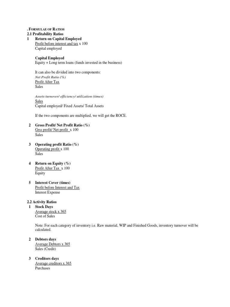 2.2 Activity Ratios 1 Stock Days Average stock x 365 Cost of Sales Note: For each category of inventory i.e. Raw material, WIP and Finished Goods, inventory turnover will be calculated. 2 Debtors days Average Debtors x 365 Sales (Credit) Creditors days Average creditors x 365 Purchases