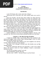 Freckles Introduction I said, 'Hi! Donna, this is Jack. Jack, this is Donna.' Donna gave him a big smile. Her smile usually makes men weak in the legs. Susie has freckles, and she hates them! 'When I'm older they'll be one BIG freckle, all over me!' she thinks. And Susie has problems with boys. 'Great legs, but I don't like the freckles,' one boy says about her. Her best friend, Donna, never has problems with boys. Donna has pretty hair, nice teeth and blue eyes and she hasn't got freckles! Boys fall at her feet. But now there's a new boy at the school, and Donna wants him too! Will Jack fall at Donna's feet? Will he laugh at Susie's freckles? In this story, Susie and Donna learn an important lesson about life. Andrew Matthews was born in Wales in 1948. He taught English for many years, but he also wrote more than forty books for children and young people. Two of his books for teenagers are Writing in Martian and Seeing in Moonlight. He wrote this story for Penguin Readers. Andrew Matthews now lives in Reading, England, with his wife and their cats. The cats sit on his books and push his pens on to the floor. Chapter 1 My Big Teenage Problem