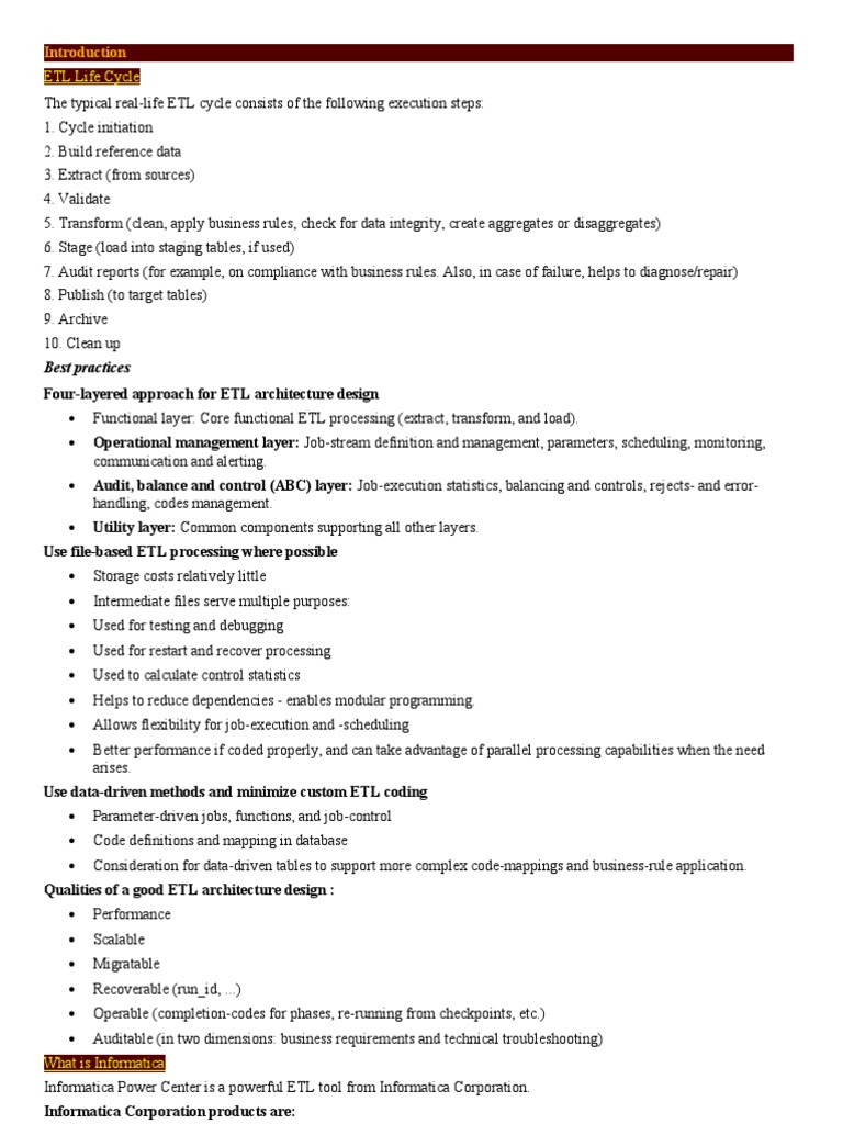 94. What will happen if you copy the mapping from one repository to another repository and if there is no identical source? 95. How can you limit number of running sessions in a workflow? 96. An Aggregate transformation has 4 ports (l sum (col 1), group by col 2, col3), which port should be the output? 97. What is a dynamic lookup and what is the significance of NewLookupRow? How will use them for rejecting duplicate records? 98. If you have more than one pipeline in your mapping how will change the order of load? 99. When you export a workflow from Repository Manager, what does this xml contain? Workflow only? 100. Your session failed and when you try to open a log file, it complains that the session details are not available. How would do trace the error? What log file would you seek for? 101. You want to attach a file as an email attachment from a particular directory using email task in Informatica, How will you do it? 102. You have a requirement to alert you of any long running sessions in your workflow. How can you create a workflow that will send you email for sessions running more than 30 minutes. You can use any method, shell script, procedure or Informatica mapping or workflow control? Data warehousing Concepts Based Interview Questions 1. What is a data-warehouse? 2. What are Data Marts? 3. What is ER Diagram? 4. What is a Star Schema? 5. What is Dimensional Modelling? 6. What Snow Flake Schema? 7. What are the Different methods of loading Dimension tables? 8. What are Aggregate tables? 9. What is the Difference between OLTP and OLAP? 10. What is ETL? 11. What are the various ETL tools in the Market? 12. What are the various Reporting tools in the Market? 13. What is Fact table? 14. What is a dimension table? 15. What is a lookup table? 16. What is a general purpose scheduling tool? Name some of them? 17. What are modeling tools available in the Market? Name some of them? 18. What is real time data-warehousing? 19. What is data mining? 20. What is Normalization? First Normal Form, Second Normal Form , Third Normal Form? 21. What is ODS? 22. What type of Indexing mechanism do we need to use for a typical Data warehouse? 23. Which columns go to the fact table and which columns go the dimension table? (My user needs to see <data element<data element broken by <data element<data element> All elements before broken = Fact Measures All elements after broken = Dimension Elements 24. What is a level of Granularity of a fact table? What does this signify?(Weekly level summarization there is no need to have Invoice Number in the fact table anymore) 25. How are the Dimension tables designed? De-Normalized, Wide, Short, Use Surrogate Keys, Contain Additional date fields and flags. 26. What are slowly changing dimensions? 27. What are non-additive facts? (Inventory,Account balances in bank) 28. What are conformed dimensions? 29. What is VLDB? (Database is too large to back up in a time frame then it's a VLDB) 30. What are SCD1, SCD2 and SCD3?