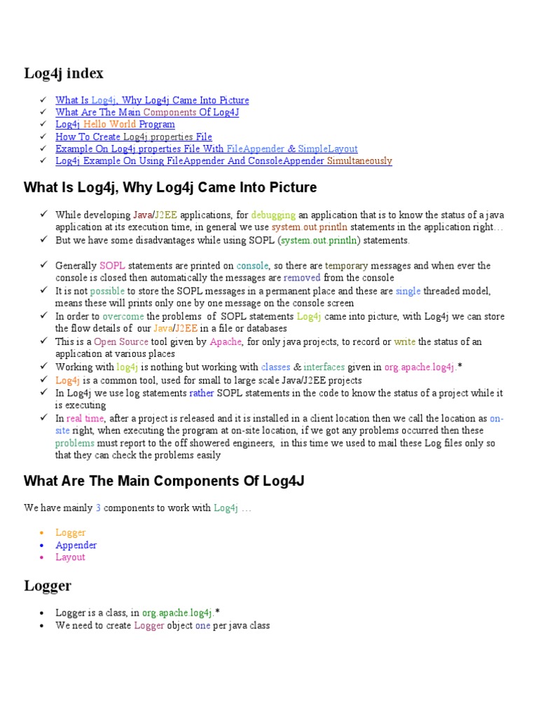 What Is Log4j, Why Log4j Came Into Picture What Are The Main Components Of Log4J Log4j Hello World Program How To Create Log4j.properties File Example On Log4j.properties File With FileAppender & SimpleLayout Log4j Example On Using FileAppender And ConsoleAppender Simultaneously