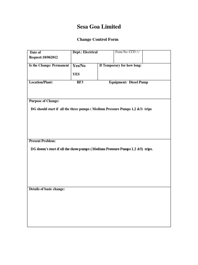Date of Request:18/062012 Is the Change: Permanent Dept.: Electrical