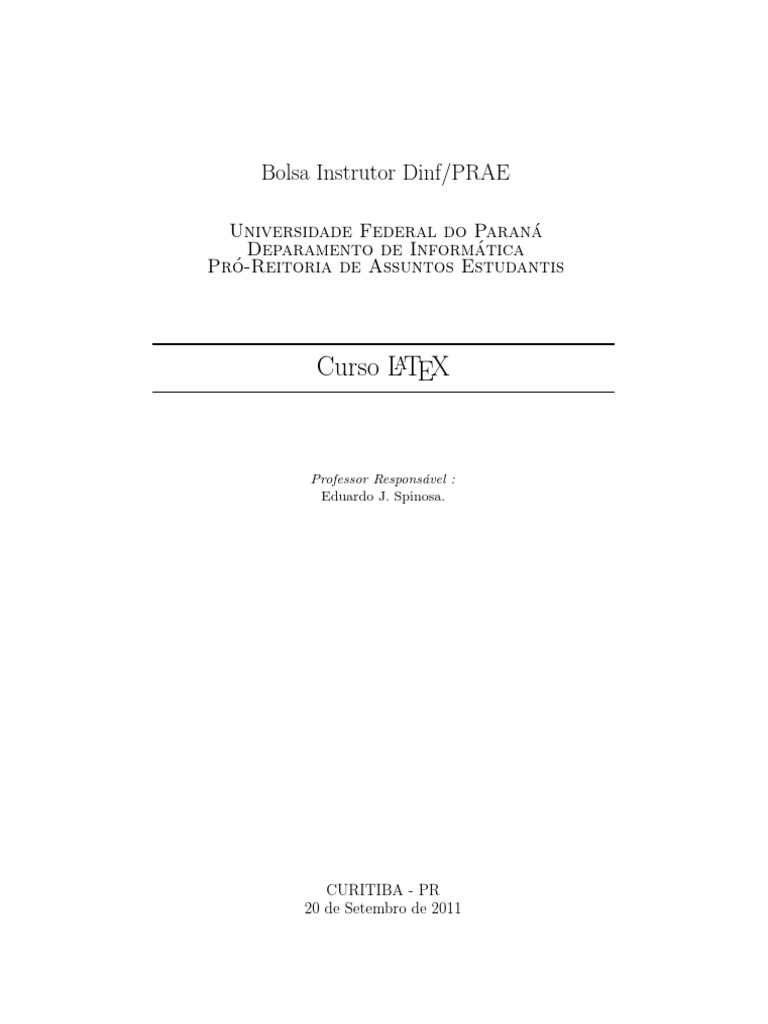 \usepackage[latin1]{inputenc} \begin{document} % Texto e comandos locais Hello World! \end{document} O texto foi obtido com o ambiente verbatim: \begin{verbatim} O texto nesse ambiente e impresso exatamente como digitado. \end{verbatim} O ambiente verbatim cria um paragrafo para o texto, para o mesmo efeito por em dentro de uma linha use o comando \verb!texto! , se voc e usar o car acter ! no texto, pode substitui-lo por outro n ao usado no texto, como # . A Um arquivo em L TEX cont em o texto e comandos de como o texto deve ser processado, palavras s ao separadas por um ou mais espa cos, par agrafos s ao separados por uma ou mais linhas em branco; comandos s ao iniciados com \, uma \ sozinha produz um espa co; lembre-se de n ao digitar nenhum dos caracteres especiais & $ # % _ { } ^ ~ \ exceto como um comando, para imprimir esses caracteres use os comandos: \& \$ \# \% \_ \{ \} \^{} \~{} $\backslash$; para aspas use aspas", veja tamb em os comandos para fechar/criar p aginas e pulo de linha em 3.1 e comandos para modicar o layout da p agina em 4. Um ambiente e uma regi ao do texto que tem um tratamento especial denido pelo autor, um ambiente come ca com \begin{nome do ambiente} e termina com \end{nome do ambiente}, como por exemplo o ambiente \begin{document} e \end{document} que dene onde come ca e termina A o arquivo a ser processado pelo L TEX Normalmente todo arquivo .tex tem um pre ambulo e um corpo, tudo entre \documentclass{} e \begin{document} e o pre ambulo do arquivo, as deni c oes aqui afetam todo o documento, como tipo do documento, formato do papel, altura e largura do texto, se nenhuma deni c ao for escolhida A oL TEX dene valores standart; \documentclass{} dene a classe do documento, \begin{document} e \end{document} denem o come co e o nal do arquivo, o corpo do arquivo, com o texto e seus comandos locais; oqu e A estiver escrito ap os % e um coment ario e ser a ignorado pelo L TEX .