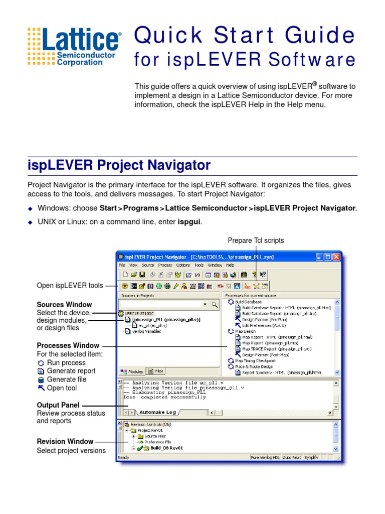This guide offers a quick overview of using ispLEVER software to implement a design in a Lattice Semiconductor device. For more information, check the ispLEVER Help in the Help menu.